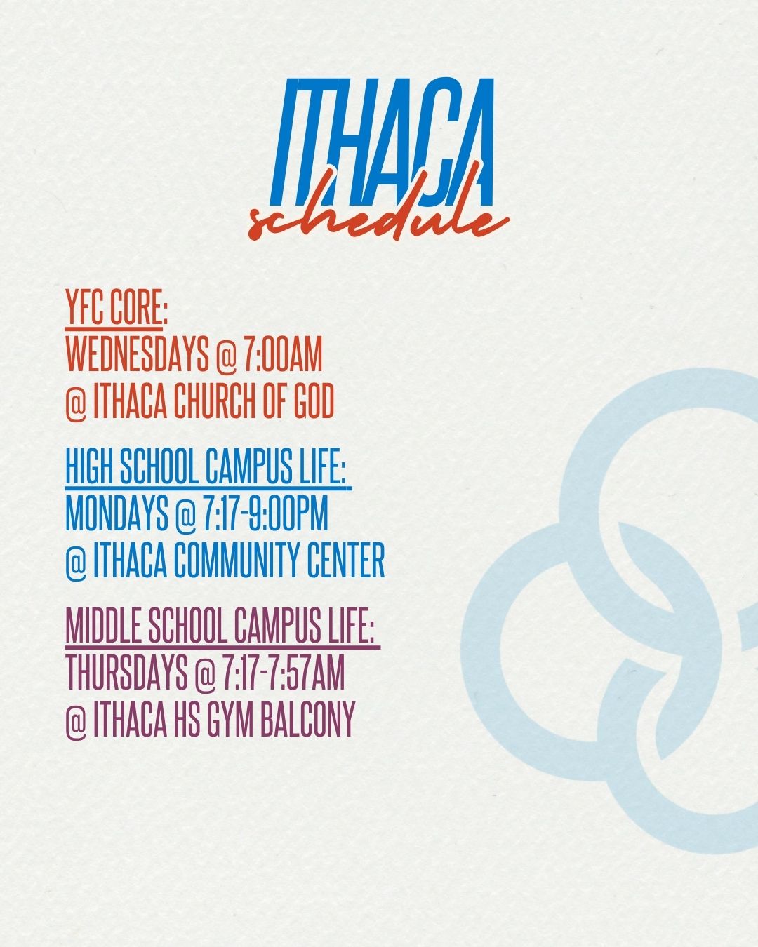 Campus Life Middle School meets Thursday mornings from 7:17-7:57 am at Ithaca Jr/Sr High School in the Gym Balcony. Spring 2026 Kick Off is JANUARY 15TH.